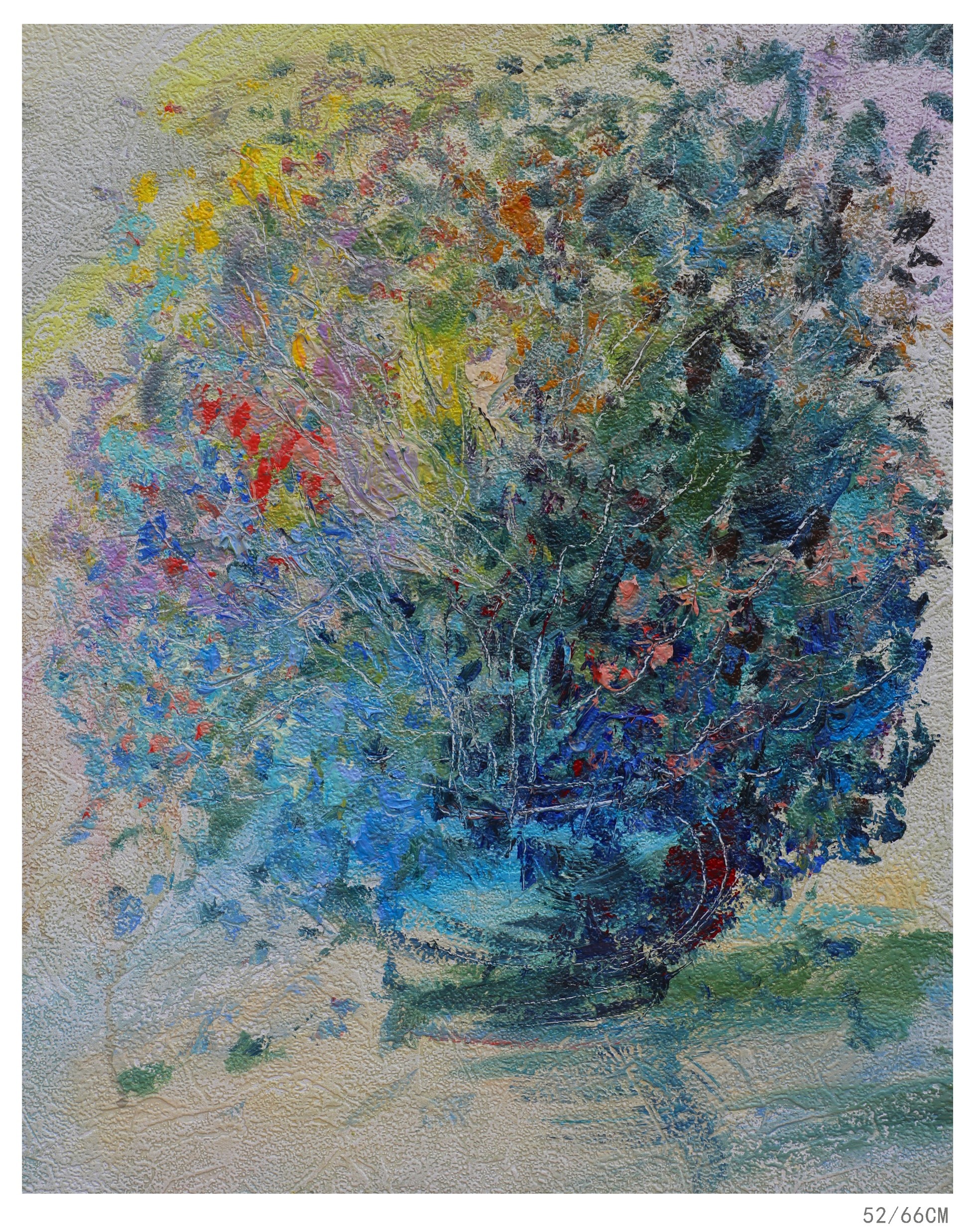 五十载光阴沉淀了对人生的些许思索,办一场画展的念头早已在心底酝酿。而一场突如其来的命悬一线、九死一生的生命体验,像一道天穹中射向我的未来之光,骤然照醒了生命的本真——原来我们追寻的灿烂,从不在遥不可及的远方,而在每一个热烈绽放的当下。于是有了这些色彩炽烈的作品:盛放的夏花、万物的生长聚合成一种情绪冲破着凡世藩篱,在光影中舒展每一寸肌理,既有向阳而生的昂扬,亦有历经风雨后的从容。它们是对生命最直白的礼赞:不必畏惧生命凋零,只因热烈生命绽放;不必怅惘人生的过往,只因此刻的缤纷已足够动人。