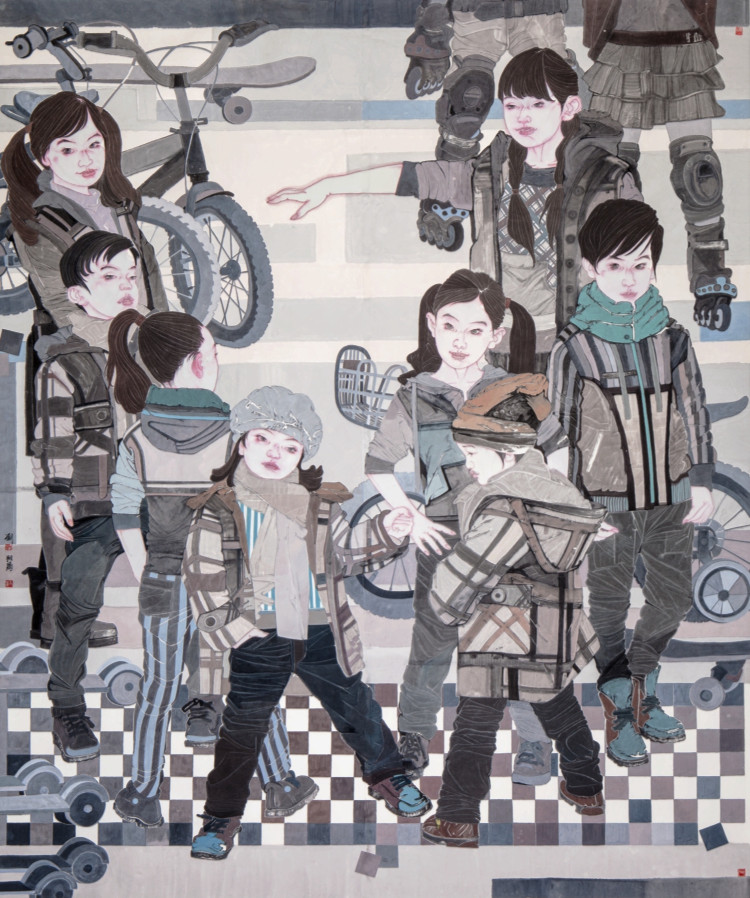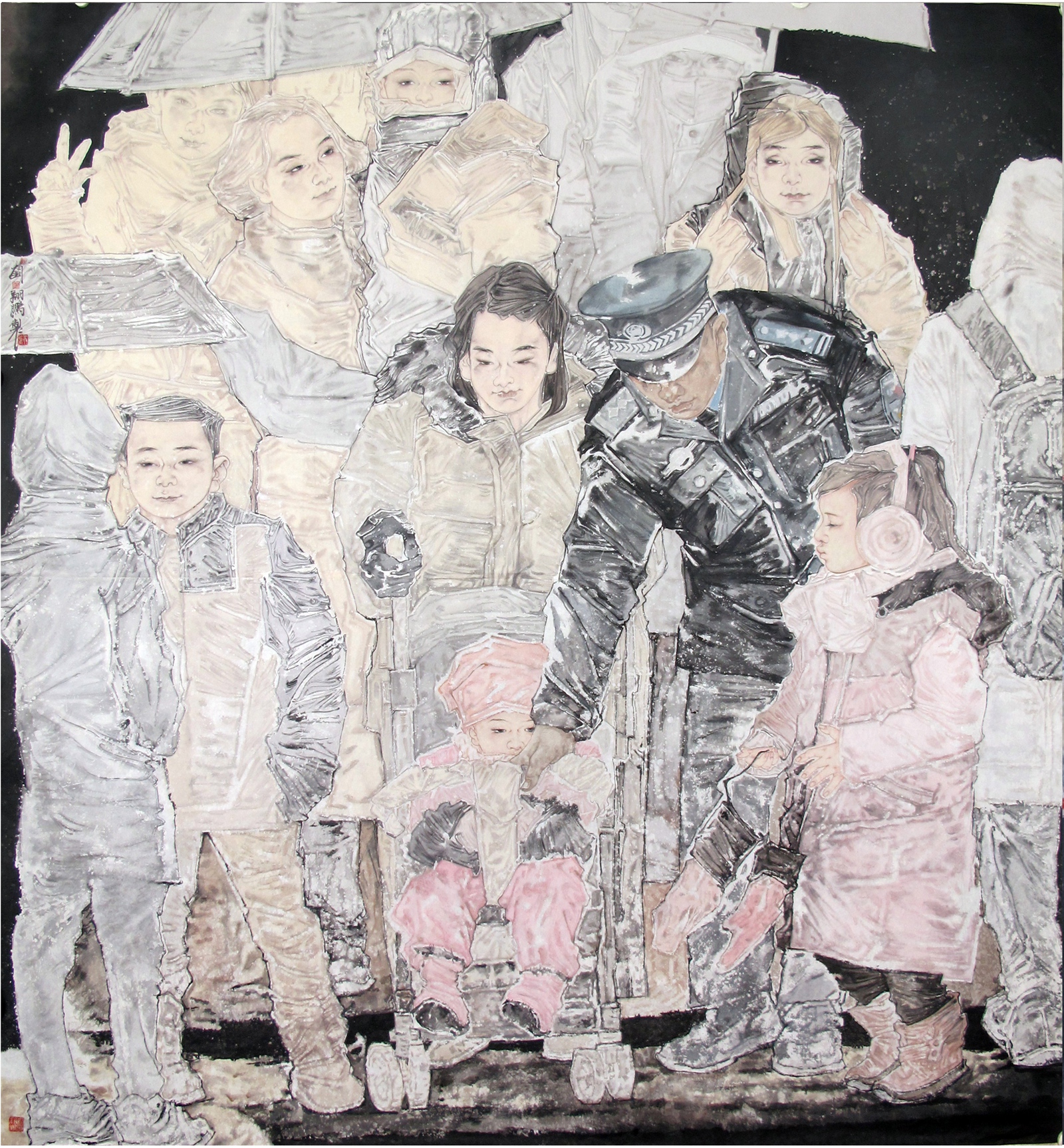 我的创作灵感,始终扎根在生活的土壤里。走在街头巷尾,看现代都市生活中人们的匆匆步伐,孩童追着落叶跑过的街道,这些寻常瞬间总让我心生触动,我会记下这片段的瞬间,以水墨还原当时的光影与温度,让市井的烟火气浸染在墨色里;画母子题材时,我总想起自家孩子幼时依偎在怀的软糯,那些凝望的眼神、轻拍的手掌,便自然而然融进笔触,淡墨浅彩间,把最纯粹的亲情酿成岁月里的甜;绘青春少女时,我会捕捉她们低头读书时的专注、浅笑交谈时的明媚,用清雅的墨色、流畅的线条,将那份独有的澄澈与温雅,化作水墨里的诗,似一缕清风拂过人心。