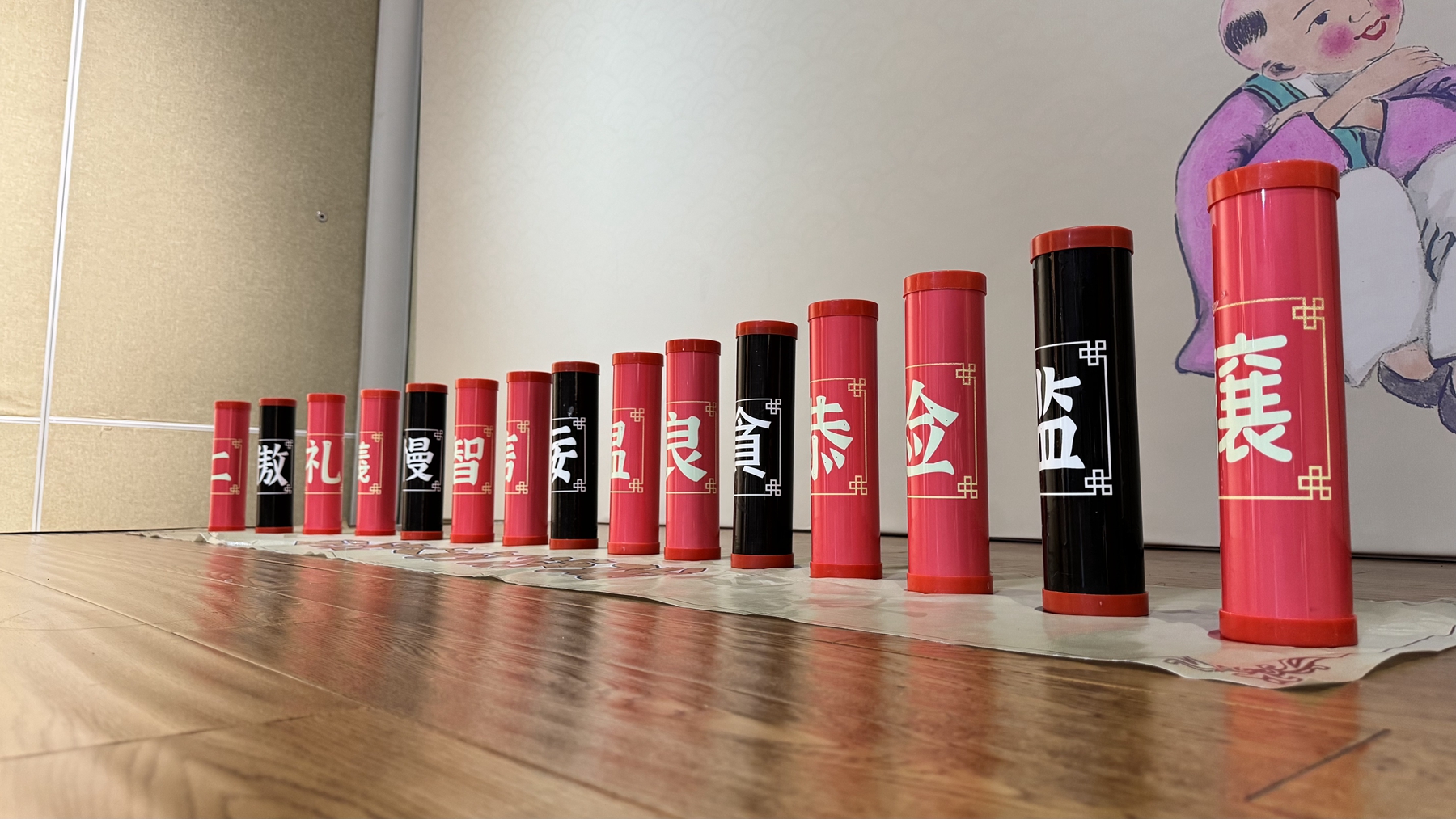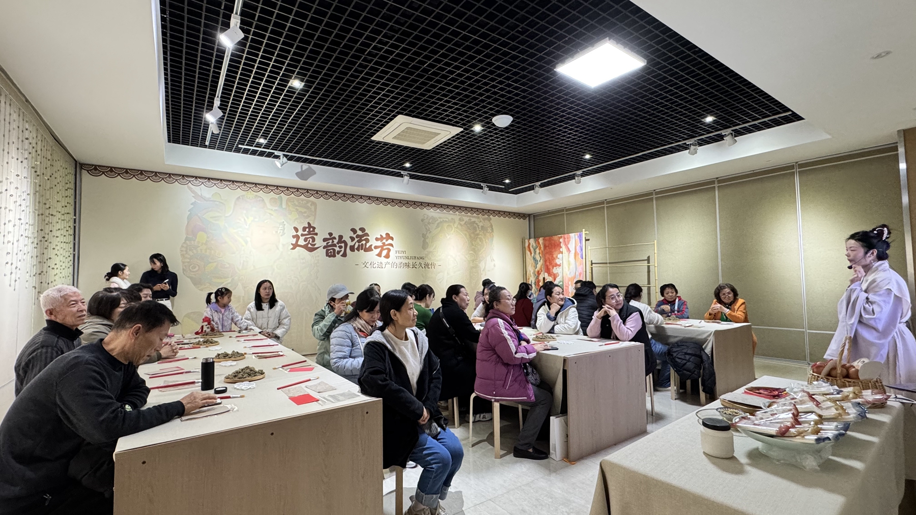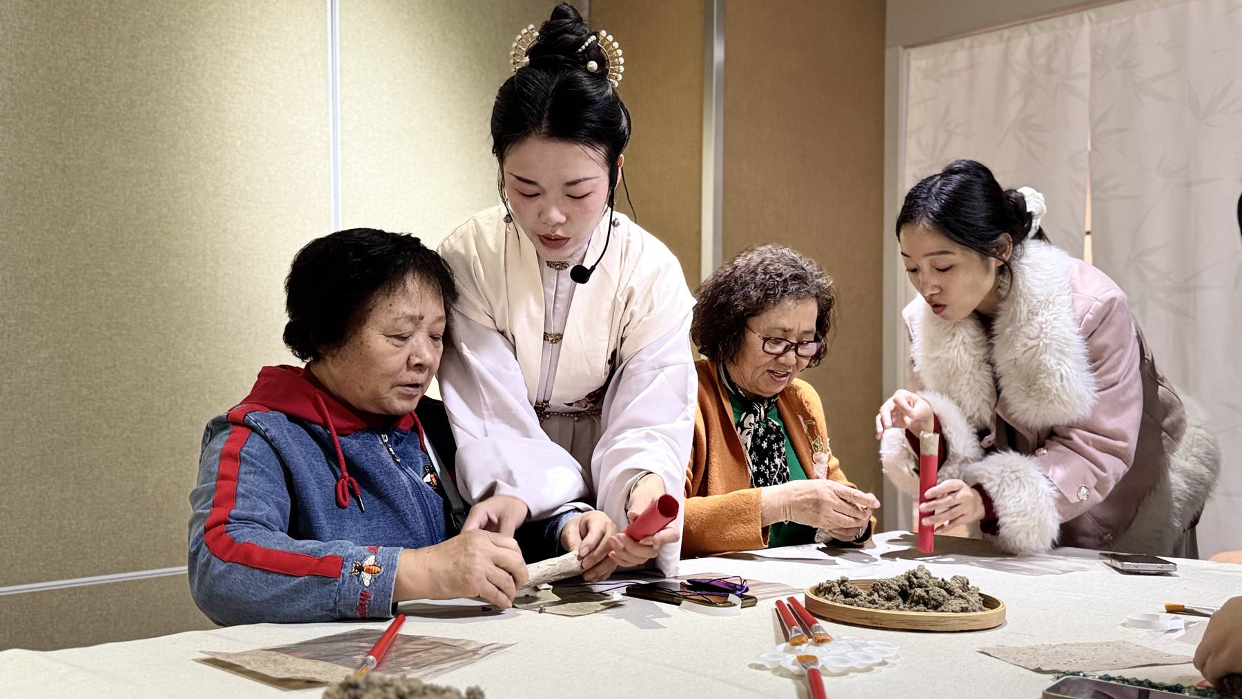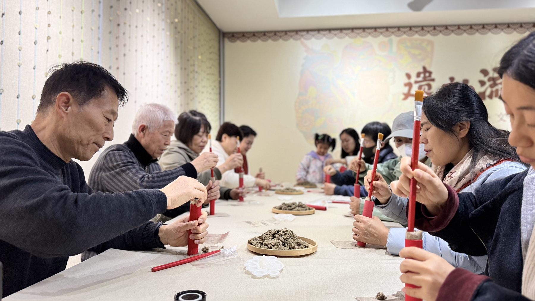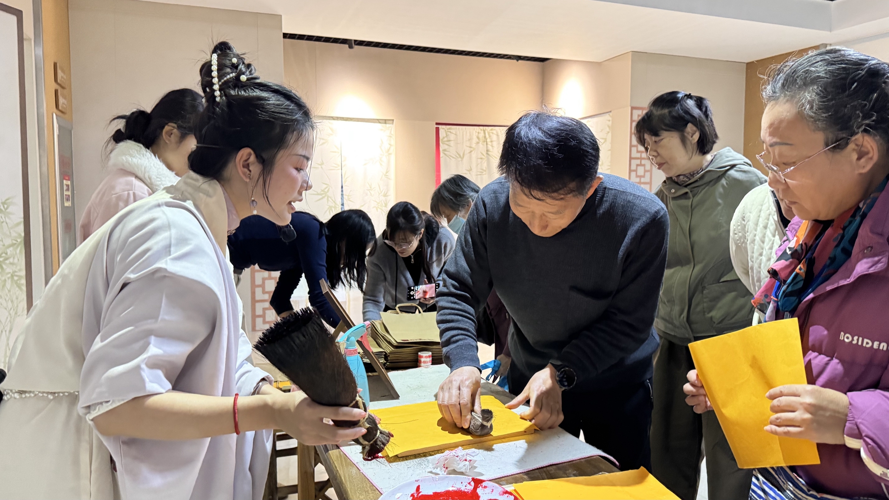 “福字拓印”区则是一派宁静雅致。长者们手持拓包,蘸取浓淡适宜的墨汁,在宣纸上来回匀力按压,随着拓包起落,一个个苍劲有力的“福”字逐渐显现。大家小心翼翼地将拓好的“百福图”装裱入框,轻声交流拓印技巧,把对生活的美好期许与传统文化印记一同珍藏。