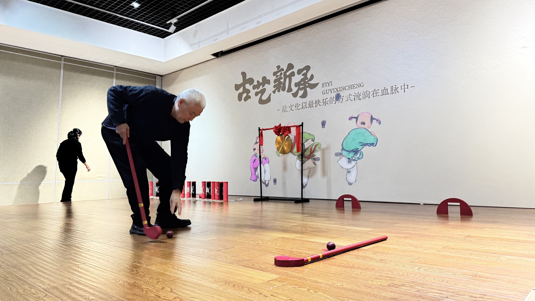 传统游戏区更成了欢乐的海洋。投壶区前,长者们手持箭矢瞄准壶口,或屏息凝神、或轻笑着调整姿势;捶丸场地里,大家挥杆击打彩球,输赢间满是孩童般的雀跃。每当有人成功投中、击球入洞,周围便响起阵阵喝彩,获胜者接过工作人员递上的“福”字彩蛋时,脸上的笑容格外灿烂,童趣与暖意在此刻交融。